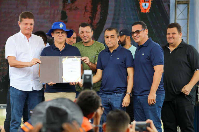 O prefeito de Manaus, David Almeida, ao lado do vice-prefeito e chefe da Casa Civil, Marcos Rotta, assinou, nesta quinta-feira, 11/5, a ordem de serviço para a construção do Terminal de Integração 7, o T7, que será localizado na avenida Torquato Tapajós, esquina com avenida