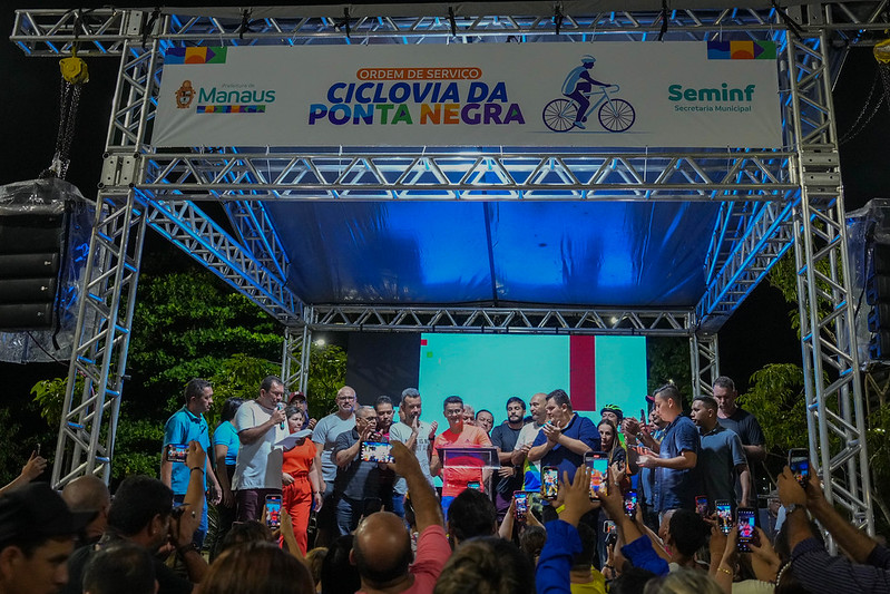 O prefeito de Manaus, David Almeida, ao lado do titular da Secretaria Municipal de Infraestrutura (Seminf), Renato Júnior, assinou, na noite desta quarta-feira, 3/5, a ordem de serviço para construção de uma ciclovia de 3,6 quilômetros de extensão, na avenida Coronel Teixeira, no bairro Ponta Negra, zona Oeste. A obra representa um investimento de R$ 4 milhões e vai atender as normas de trânsito, tendo duplo sentido e vias segregadas do fluxo principal de veículos.