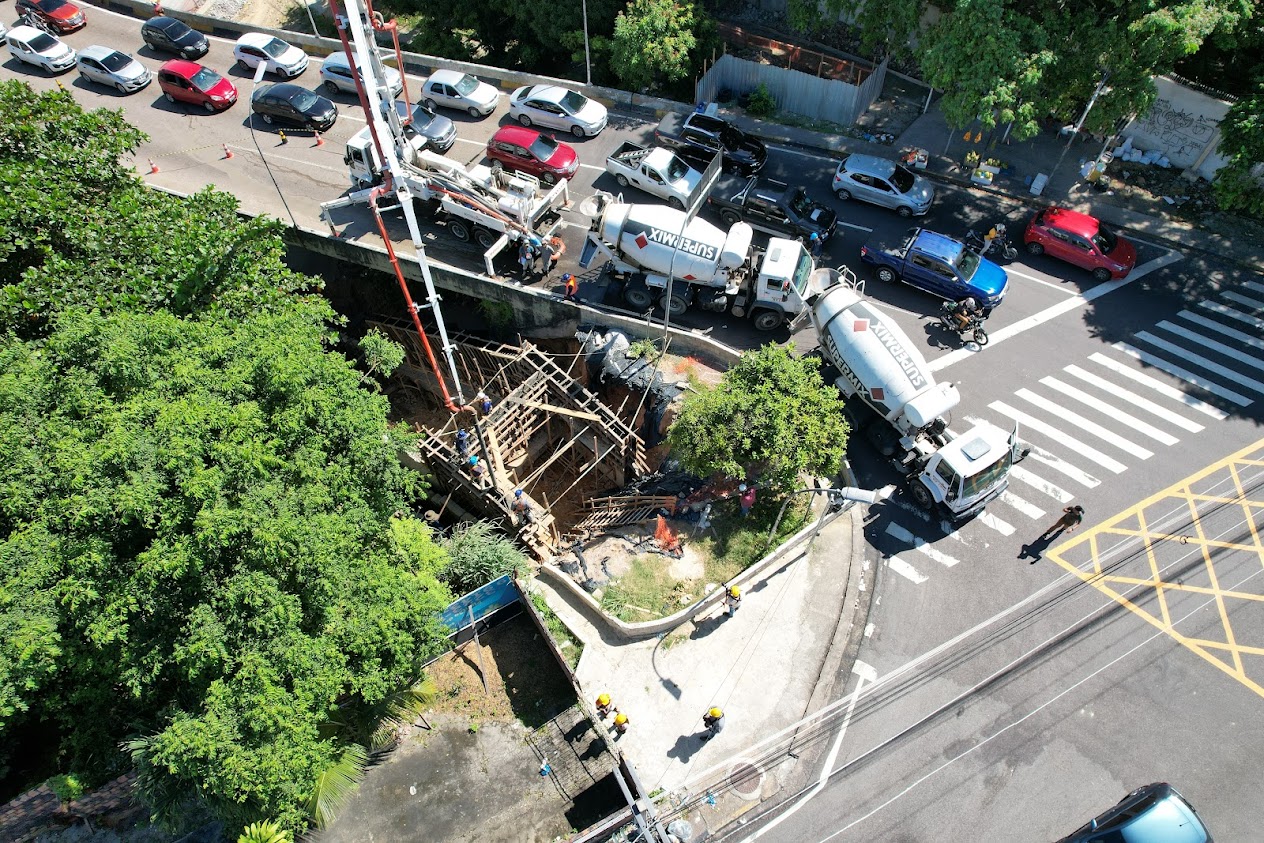 As equipes da Prefeitura de Manaus também atuaram na implantação de uma rede de drenagem profunda, com 30 metros de extensão, para evitar que a água das chuvas atinja novamente as casas ao lado do viaduto. O local está sendo totalmente revitalizado e será concluído com asfaltamento de todo o beco e das vias do entorno.