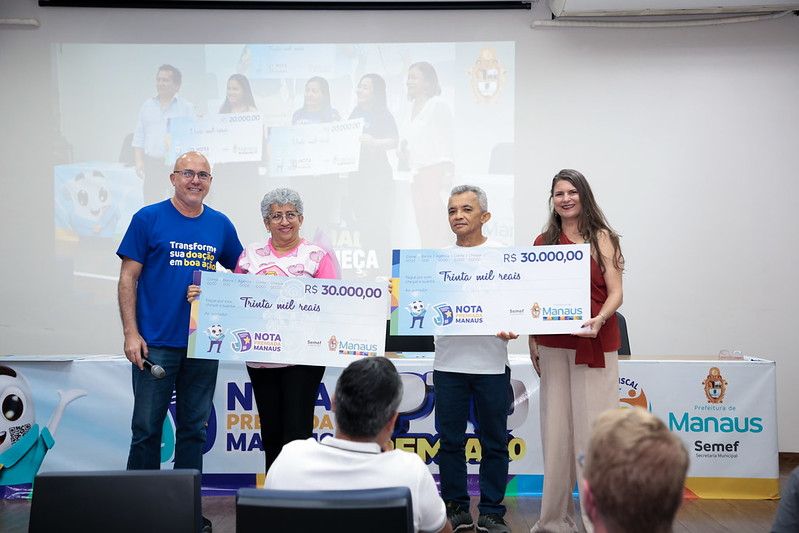 Em mais uma premiação da campanha Nota Premiada, a Prefeitura de Manaus, por meio da Secretaria Municipal de Finanças, Planejamento e Tecnologia da Informação (Semef), entregou, nesta quinta-feira, 30/10, os cheques simbólicos aos contemplados do oitavo sorteio do ano, que somou R$ 200 mil em prêmios. A cerimônia ocorreu no auditório da Subsecretaria da Receita da Semef, localizado na avenida Japurá, no Centro, zona Sul.